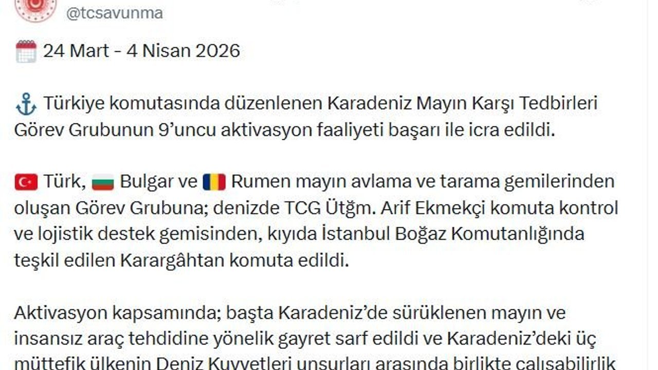 Bakanlığın sanal medya hesabından yapılan açıklamada, 'Türkiye komutasında düzenlenen Karadeniz Mayın Karşı Tedbirleri Görev Grubu'nun 9'uncu aktivasyon faaliyeti başarı ile icra edildi. Türk, Bulgar ve Rumen mayın avlama ve tarama gemilerinden oluşan Görev Grubuna; denizde TCG Üsteğmen Arif Ekmekçi komuta kontrol ve lojistik destek gemisinden, kıyıda İstanbul Boğaz Komutanlığında teşkil edilen karargahtan komuta edildi. Aktivasyon kapsamında; başta Karadeniz'de sürüklenen mayın ve insansız araç tehdidine yönelik gayret sarf edildi ve Karadeniz'deki üç müttefik ülkenin Deniz Kuvvetleri unsurları arasında birlikte çalışabilirlik seviyesi artırıldı' ifadelerine yer verildi. (DHA)