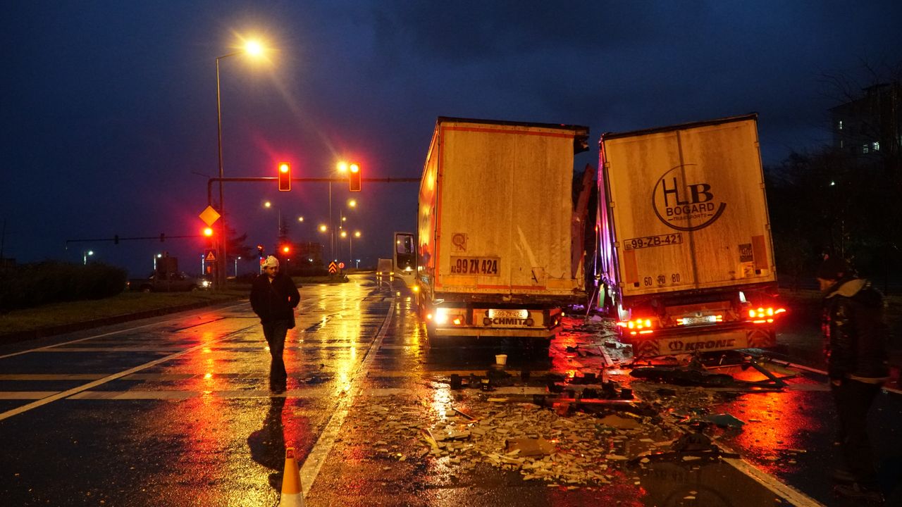Kaza, saat 06.30 sıralarında Karadeniz Sahil Yolu'nun Kirazlık Mahallesi mevkisinde meydana geldi. Rize'den Artvin istikametine giden Azerbaycan uyruklu Z.E. idaresindeki yapı malzemesi yüklü 99 FT 421 plakalı TIR, yağış nedeniyle kayganlaşan yolda kontrolden çıkarak sinyalizasyon ışıklarında duran 77 JR 595 plakalı TIR'a çarptıktan sonra yol kenarındaki kaldırıma çıktı. Kazada kabin kısmında sıkışan şoför Z.E., yaralandı. İhbarla bölgeye sağlık, AFAD ve polis ekipleri sevk edildi. Ekiplerin çalışmasıyla sıkıştığı yerden çıkarılan şoför, ambulansla Kaçkar Devlet Hastanesi'ne kaldırıldı. Z.E.'nin durumunun iyi olduğu belirtildi.