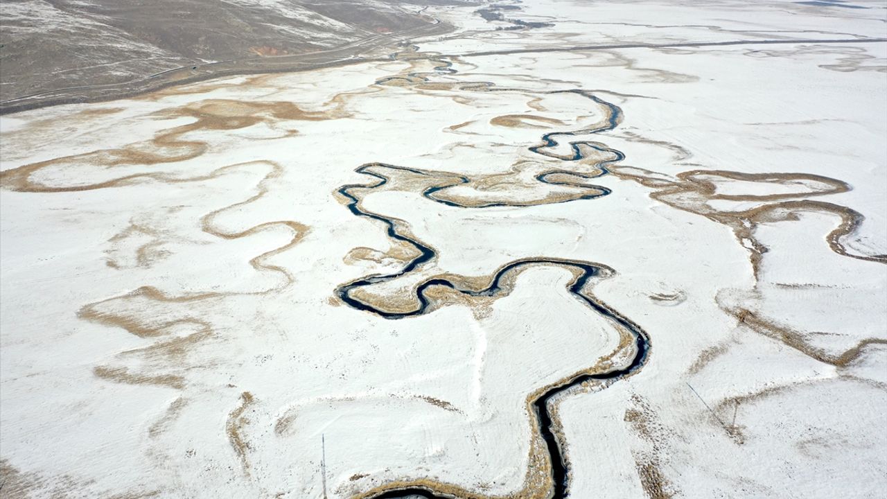 Dronla görüntülenen kar altındaki menderesler güzel görüntü oluşturdu.