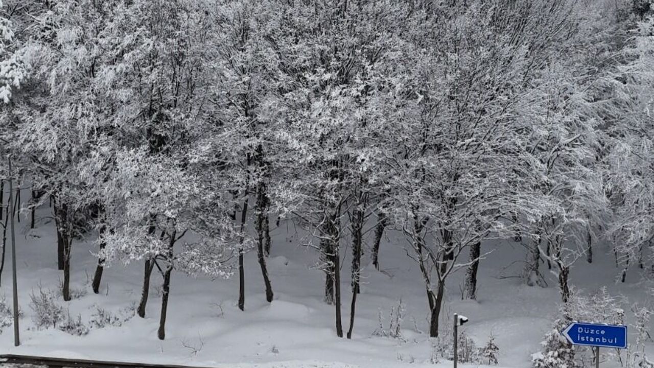 Bolu Dağı'nın D-100 kara yolu geçişinde kar yağışı sonrası beyaz örtü oluştu. Çam ormanlarıyla çevrili Bolu Dağı da beyaza büründü. Karla kaplı ormanlar dronla görüntülendi, araçların sağlı sollu ormanlar arasından geçtiği görüldü. (DHA)