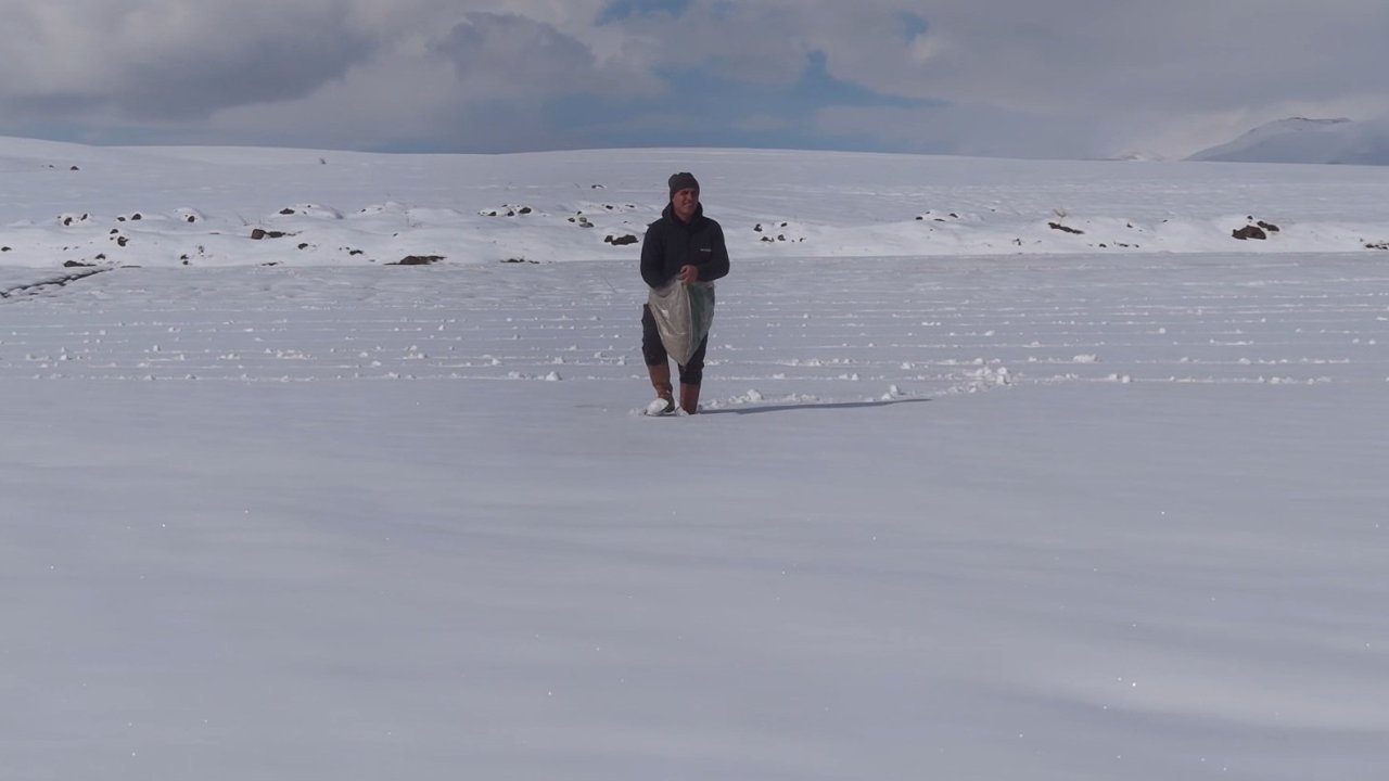 Geçen yıl aynı yöntemi başka bir tarlada denediklerini ve olumlu sonuç aldıklarını kaydeden Yalçın, 'Benzer özellikte, eğimsiz bir tarlada denedik ve çok iyi verim aldık. Şimdi aynı yöntemi bu yıl da bu tarlamızda uyguluyoruz. Kar üzerine serptiğimiz tohumlar bir süre sonra toprağa ulaşacak. İlkbaharda toprak gece donup gündüz çözülüyor. Bu süreçte oluşan küçük çatlaklar sayesinde tohumlar toprağa inerek gömülüyor. Biz ekimimizi yaptık, gerisi nasip' diye konuştu. (DHA)