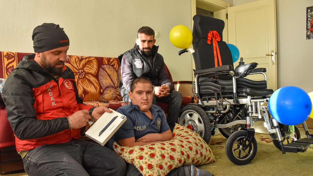 VAN (AA) - Van'da yardım ve arama kurtarma faaliyeti yürüten dernek, karnesini alan 12 yaşındaki bedensel engelli Yusuf Erban'a akülü tekerlekli sandalye, yatak, tablet ve kırtasiye malzemesi hediye etti.