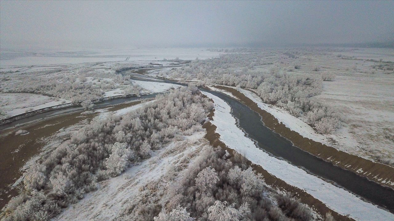 Yüzeyinde buz akan dereler ve kırağıyla kaplanan ağaçlar dronla görüntülendi.