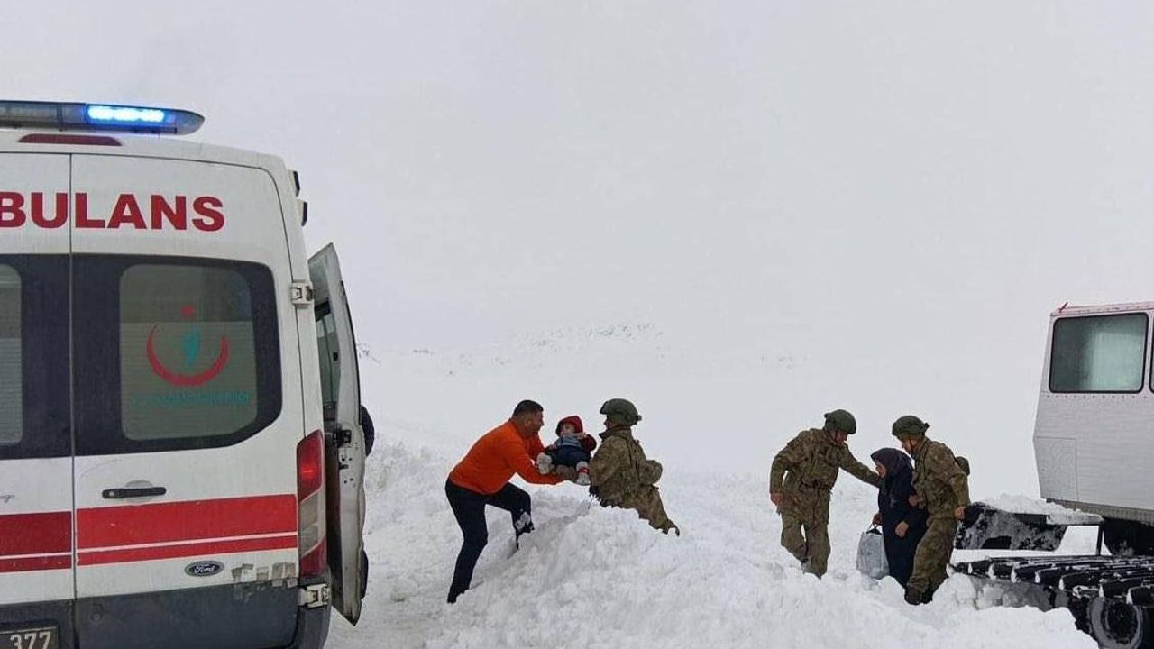 Milli Savunma Bakanlığı'ndan yapılan açıklamada, 'Kars'ın Akyaka ilçesindeki İbiş köyünde ateş ve nefes darlığı problemi yaşayan iki çocuğumuz, yoğun kar yağışı nedeniyle yolların kapalı olmasından dolayı kar üstü personel taşıma aracı ile evlerinden alınarak sağlık ekiplerine teslim edildi' denildi. (DHA)