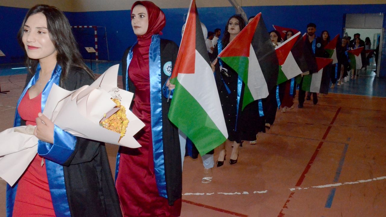 KARS (AA) - Kafkas Üniversitesinin mezuniyet törenine öğrenciler, Türkiye ve Filistin bayrakları ile "Zulme sessiz kalmak mazluma ihanet, zalime ortak olmaktır" pankartıyla katıldı.