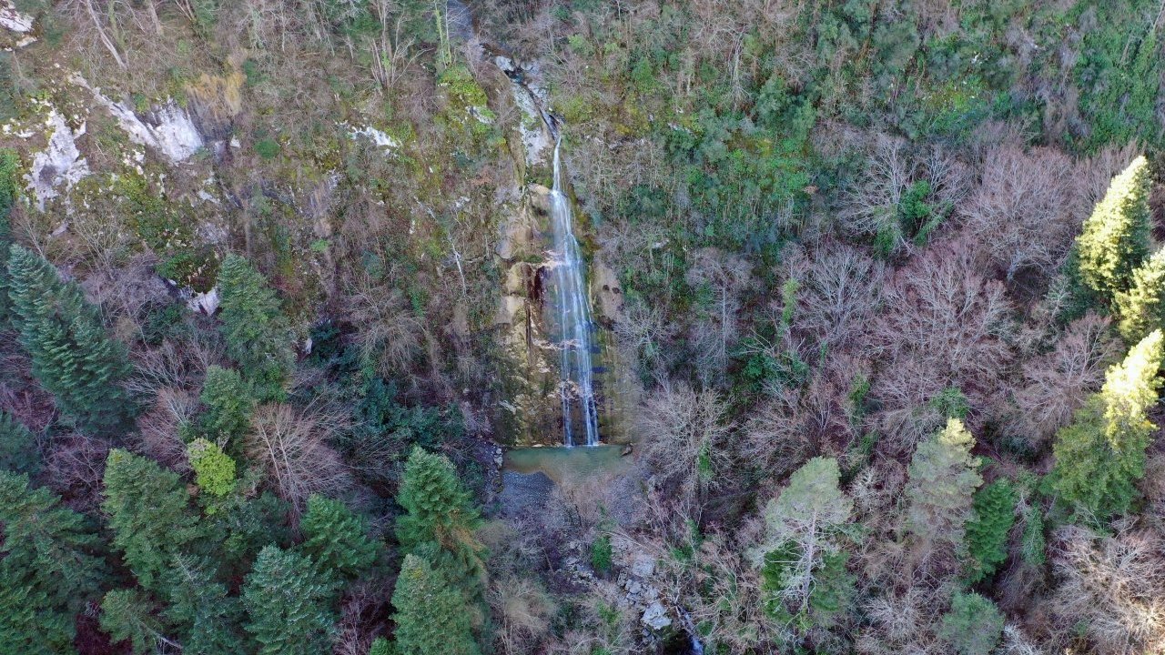 Şelale, yeşilliklerin arasındaki manzarasıyla dron pilotlarını kendisine hayran bırakıyor.