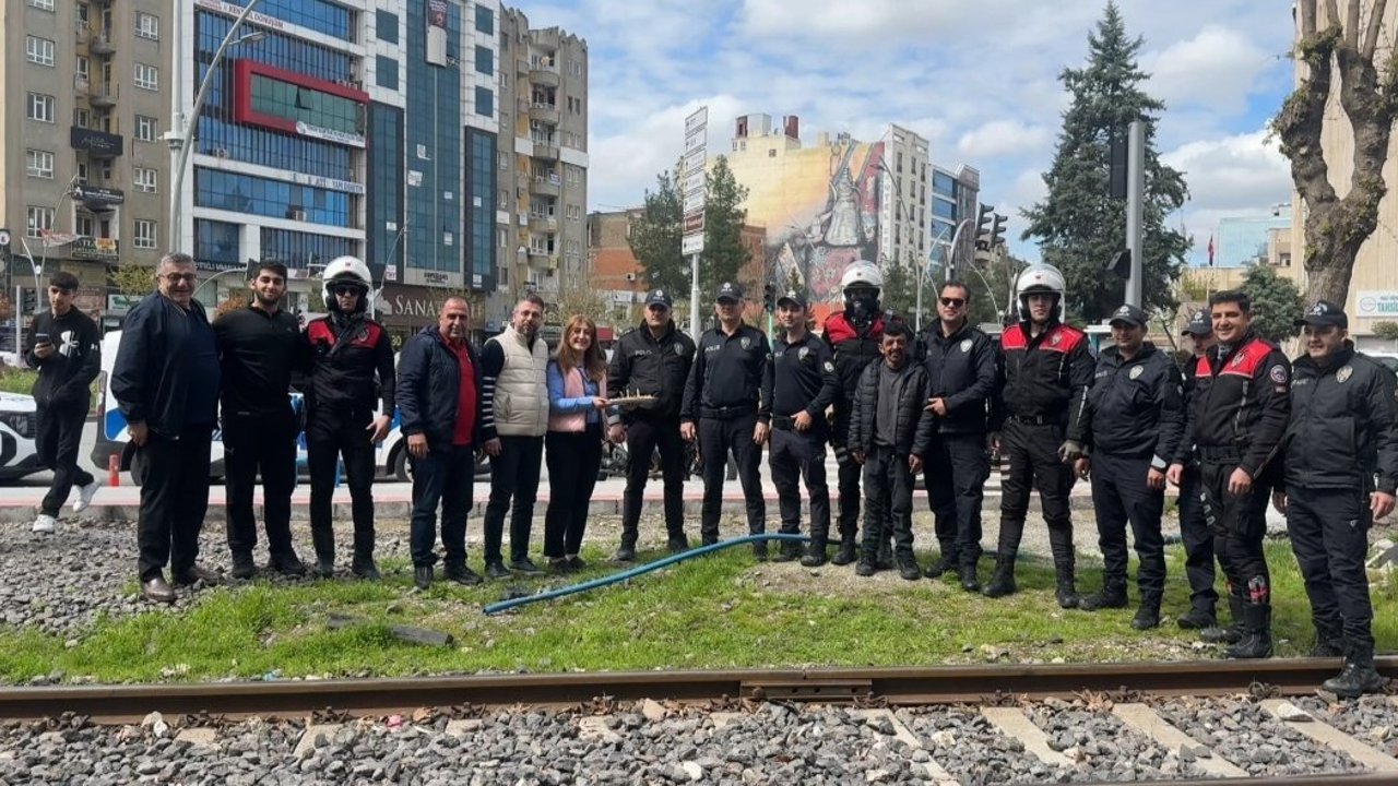 Kentte görev yapan gazeteciler, Türk Polis Teşkilatı'nın kuruluş yıl dönümü ve 10 Nisan Polis Haftası kapsamında Atatürk Bulvarı'nda bir araya geldi. 112 Acil Çağrı Merkezi'ni arayan gazeteciler, bulundukları noktada 'bıçaklı kavga' olduğu ihbarında bulunarak polis ekiplerini davet etti. Kısa sürede olay yerine ulaşan polis ekipleri, araçlarından indiklerinde kendilerini bekleyen gazetecileri gördü. Gazeteciler, gelen ekiplere baklava ikram ederek kutlama yaptı. Sürpriz karşısında duygulanan ve teşekkür eden polis ekipleri, gazetecilerle hatıra fotoğrafı çektirdi. (DHA)