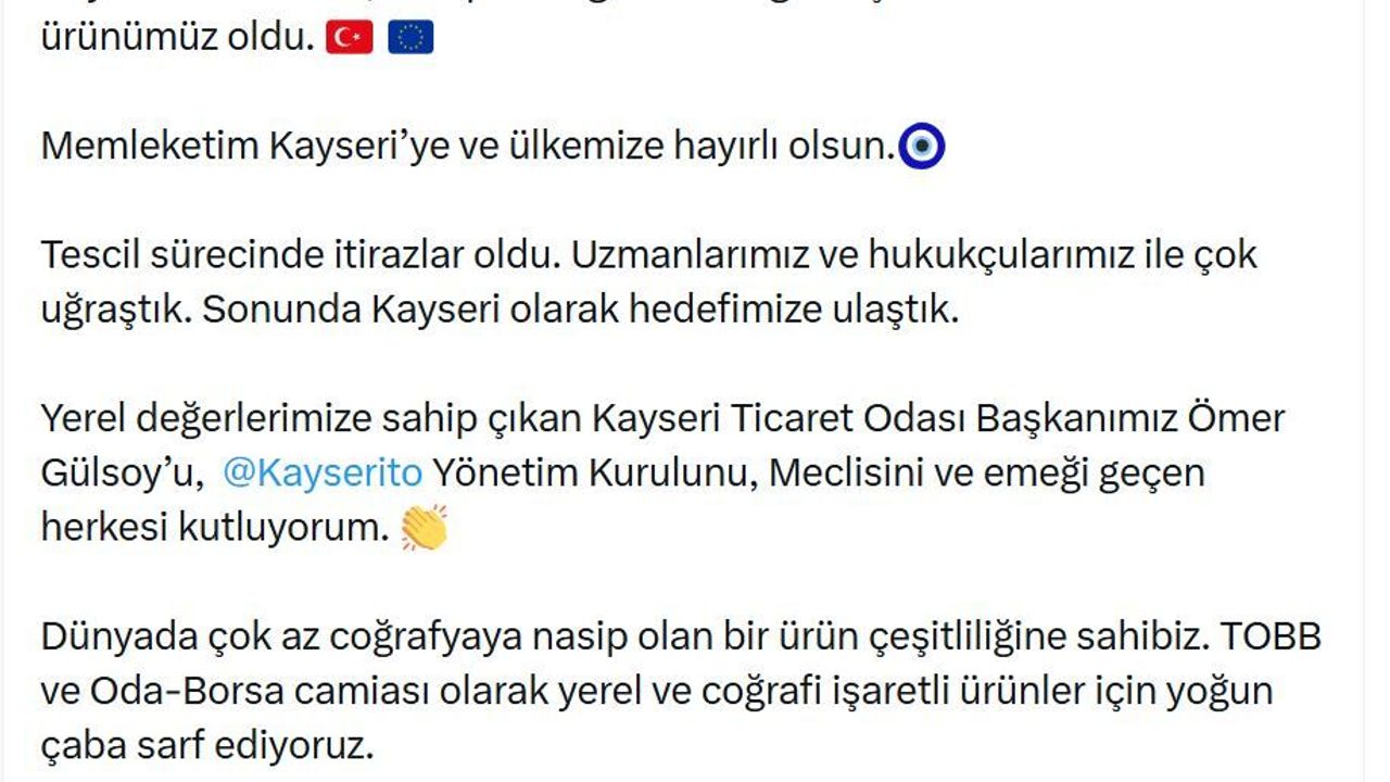 Türkiye Odalar ve Borsalar Birliği (TOBB) Başkanı Rifat Hisarcıklıoğlu da konuyla ilgili sanal medya hesabından açıklama yaptı. Hisarcıklıoğlu, 'Kayseri Pastırması, Avrupa Birliği'nden coğrafi işaret tescili alan 46'üncü ürünümüz oldu. Memleketim Kayseri'ye ve ülkemize hayırlı olsun. Tescil sürecinde itirazlar oldu. Uzmanlarımız ve hukukçularımız ile çok uğraştık. Sonunda Kayseri olarak hedefimize ulaştık. Yerel değerlerimize sahip çıkan Kayseri Ticaret Odası Başkanımız Ömer Gülsoy'u, Kayseri Ticaret Odası Yönetim Kurulunu, Meclisini ve emeği geçen herkesi kutluyorum. Dünyada çok az coğrafyaya nasip olan bir ürün çeşitliliğine sahibiz. TOBB ve Oda-Borsa camiası olarak yerel ve coğrafi işaretli ürünler için yoğun çaba sarf ediyoruz. Avrupa Birliği süreci devam eden 46 coğrafi işaret ve 2 geleneksel ürün adı ile ilgili çalışmalarımız devam ediyor' ifadelerini kullandı. (DHA)