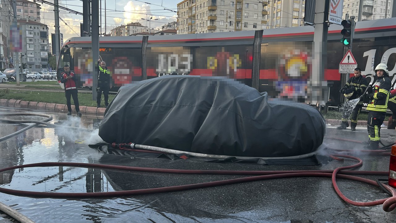 Furkan KAVUKLU/KAYSERİ, (DHA)- KAYSERİ'de seyir halindeyken alev alan elektrikli otomobil, itfaiye ekiplerinin yangın battaniyesi ile yaptığı müdahale ile söndürüldü.