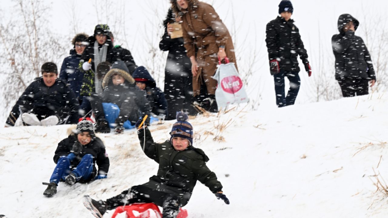 Kar yağışı ve beraberinde gelen tatili fırsat bilen çocuklar, Rıfat Yıldırım Parkı'ndaki eğimli arazide kızakla kayarak vakit geçirdi.