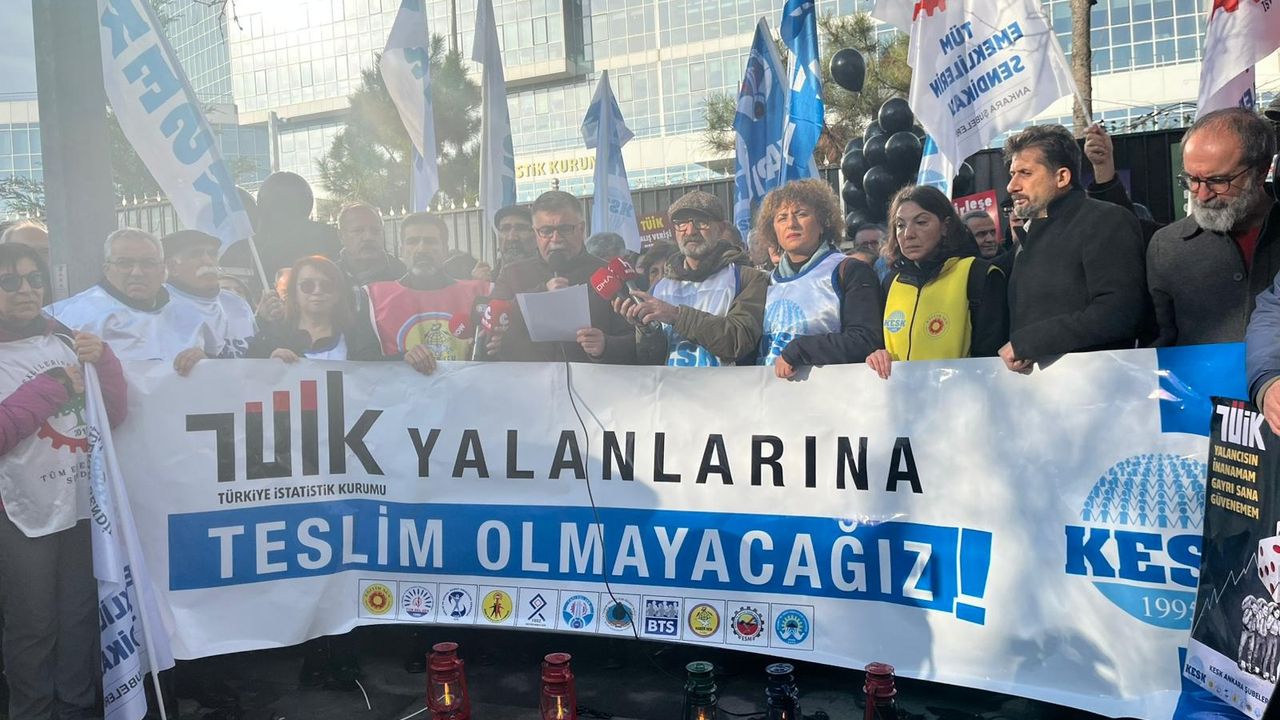 KESK üyesi yaklaşık 100 kişi, bugün açıklanan enflasyon verilerini protesto etmek için TÜİK önünde bir araya geldi. 'TÜİK'in yalanlarına teslim olmayacağız' yazılı pankart açan grup üyeleri, kandil yakıp, gökyüzüne siyah balon bıraktı. KESK Eş Genel Başkanı Ahmet Karagöz, 'Gözümüzü; iğneden ipliğe her şeye yapılan zam fırtınası ile açtığımız bir yılı, 2025 yılını geride bıraktık. Yıllardır devam eden yoksullaştırma politikalarından 4 milyon kamu emekçisi ve 2,5 milyon kamu emeklisi olarak bizler de payımıza düşeni aldık. 2025 yılı asgari ücretlisinden emeklisine, işçisinden kamu emekçisine kadar emeği ile geçinen milyonlar için, bizler için adeta bir kabus yılı oldu. Maaşlarımız her ay gittikçe erirken yoksulluğumuz günden güne arttı. Evet, 2025 yılını geride bıraktık. Ama sorunlarımız artarak devam ediyor. Ülkeyi yönetenler yıllardır çarşıda, pazarda, mutfakta yaşadığımız gerçek enflasyonun yarısına bile denk gelmeyen suni verileri resmi enflasyon olarak açıkladılar. Maaş artışlarımızı TÜİK'in bu sahte verileri ile sınırladılar. Böylece bu ülkenin ezici çoğunluğunu oluşturan bizleri, emeği ile geçim mücadelesi veren milyonları her geçen gün daha fazla yoksullaştırdılar, sefalete ittiler. 6'şar aylık bu artışlar daha ilk bir-iki ayda TÜİK'in sahte enflasyonunun bile altında kaldı. Aylarca enflasyon farkı almak için bekledik. 6'şar aylık periyotlarla hep aynı şeyi yaşamaya devam ettik. Böylece sadece son 2 yılda maaşlarımız yüzde 20 eridi' ifadelerini kullandı. (DHA)
