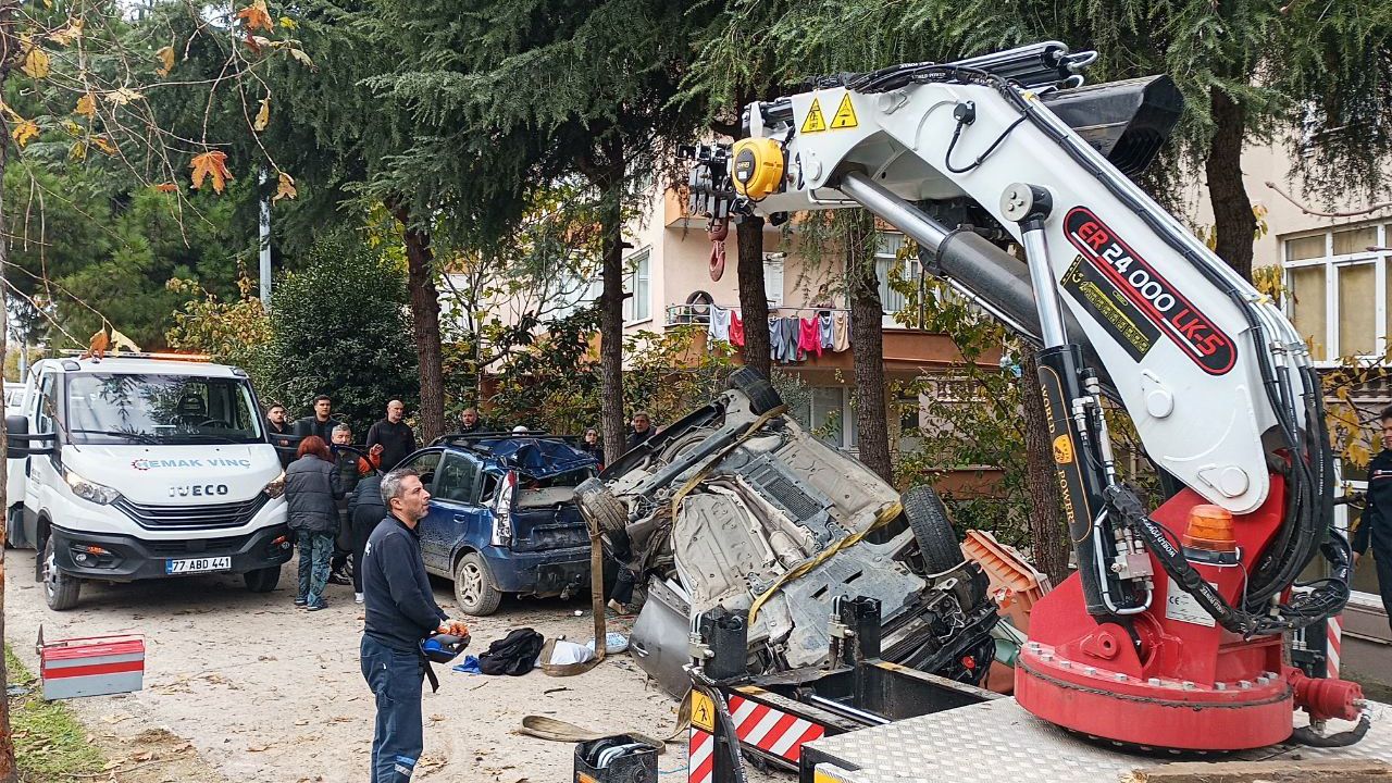 Kaldırımı aşarak devrilen otomobil, önce ağaca, ardından da yan yolda park halindeki bir otomobile vurarak durabildi.
