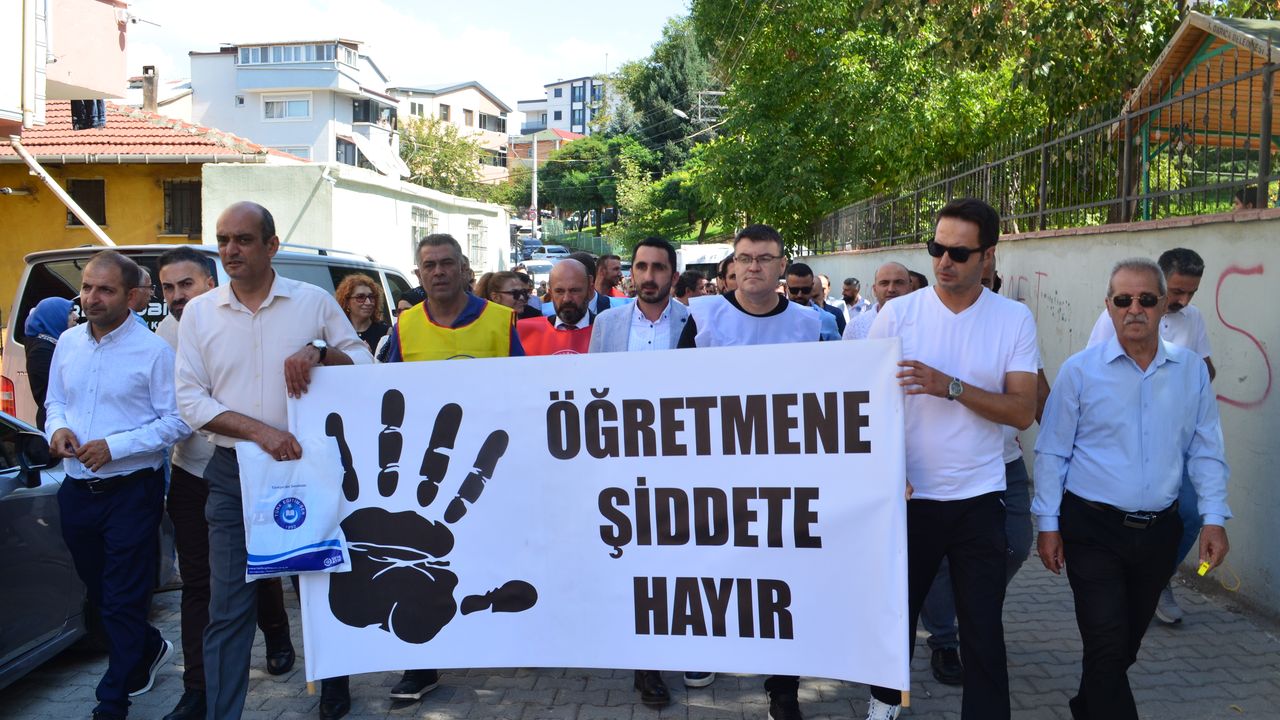 Ellerinde pankartlarla Mehmet Akif Ortaokulu önünde toplanan Eğitim-Bir-Sen, Eğitim-Sen, Türk Eğitim-Sen, Hürriyetçi Eğitim-Sen üyeleri, 'Öğretmene Şiddete Hayır' yazılı pankart açtı.