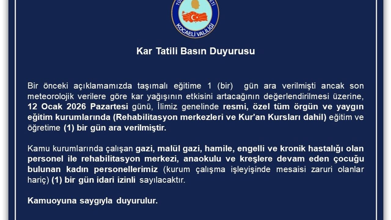 Kocaeli'de meteorolojik verilere göre etkili olması değerlendirilen kar yağışı nedeniyle eğitime yarın ara verildiği duyuruldu. Kocaeli Valiliği'nden yapılan yazılı açıklamada, 'Bir önceki açıklamamızda taşımalı eğitime 1 (bir) gün ara verilmişti ancak son meteorolojik verilere göre kar yağışının etkisini artacağının değerlendirilmesi üzerine, 12 Ocak 2026 Pazartesi günü, ilimiz genelinde resmi, özel tüm örgün ve yaygın eğitim kurumlarında (Rehabilitasyon merkezleri ve Kur'an Kursları dahil) eğitim ve öğretime (1) bir gün ara verilmiştir. Kamu kurumlarında çalışan gazi, malül gazi, hamile, engelli ve kronik hastalığı olan personel ile rehabilitasyon merkezi, anaokulu ve kreşlere devam eden çocuğu bulunan kadın personellerimiz (kurum çalışma işleyişinde mesaisi zaruri olanlar hariç) (1) bir gün idari izinli sayılacaktır' ifadelerine yer verildi. (DHA)