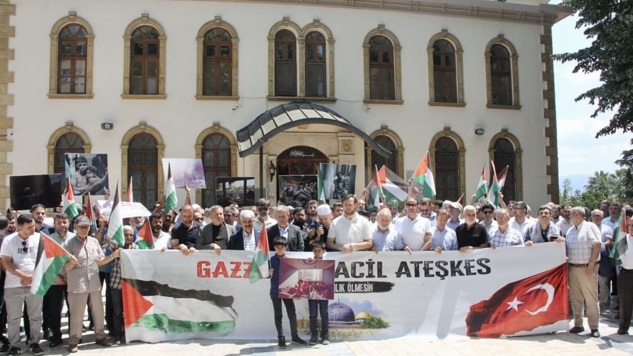 Cuma namazı sonrası Tarihi Fevziye Camisi avlusunda toplanan grup adına basın açıklamasını okuyan Kocaeli Gönüllü Kültür Teşekkülleri Dönem Başkanı Mustafa Salın, Gazze ile dünyada vicdan sahibi yüreklerin de yandığını söyledi.
