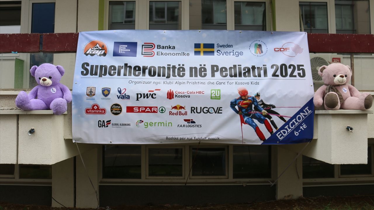 'Klubi Alpin Prishtina' topluluğu üyesi dağcılar, bu kapsamda 'süper kahraman' kostümleri giyerek çatıda kurulan düzenek sayesinde binadan halatla indi.