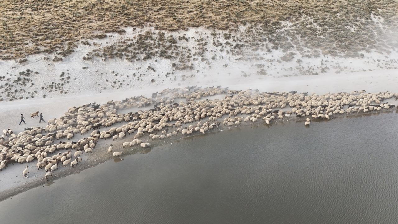 BİTLİS (AA) - Bitlis'in Tatvan ilçesinde Nemrut Dağı eteklerindeki yaylalara çıkarılan küçükbaş hayvan sürüleri, su ihtiyaçlarının karşılanması için Kalp Gölü'ne götürülüyor.