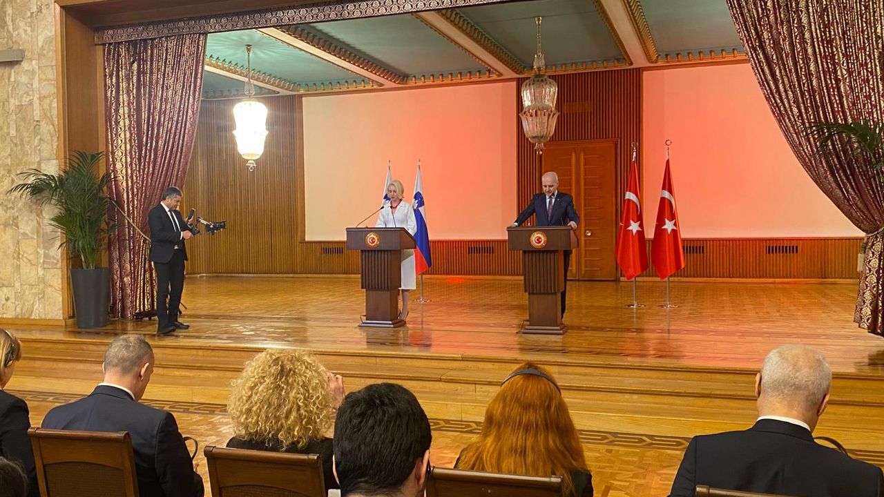 Türkiye ve Slovenya arasında yakın ilişkilerin bulunduğunu söyleyen Numan Kurtulmuş, 'Bu ilişkilerimiz artarak devam ediyor. Ticari anlamda birçok alanda; ulaştırma, enerji, turizm, savunma sanayi olmak üzere birçok alandaki ilişkilerimizi devam ettiriyoruz. Bu çerçevede şu anda 3,7 milyar dolar seviyesinde bir ikili ticaret hacmine sahibiz. Bunun önümüzdeki süreçte daha da artırılarak 5 milyar dolar seviyelerine çıkması mümkündür. Ayrıca Slovenya ile ortak bir coğrafyayı da paylaşıyoruz. Slovenya, Balkanların en batısında biz ise Balkanların en doğusunda yer alıyoruz. İki ülke de Balkanlarda barışın, istikrarın ve dostluğun gelişmesi ve güçlendirilmesi için ortak çalışmalar sürdürüyor. Ayrıca Slovenya, Doğu Avrupa ülkesi olarak Doğu Avrupa'daki bütün gelişmeleri de yakından takip ediyor ve bunlardan etkilenen bir ülke olarak Avrupa'da da barışın, istikrarın ve güvenliği sağlanması için gayret ediyor, mücadele ediyor. Türkiye olarak biz de hem bölgemizde yaşadığımız bütün sorunlarla ilgili hem de küresel ölçekte yaşadığımız sorunların tamamıyla ilgili temel perspektifimiz; barış, istikrar ve diyalog olmuştur' diye konuştu.