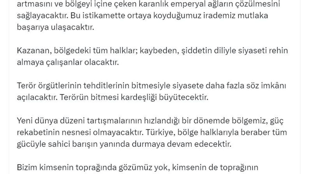 'Birlik, dirlik, bütünlük, Suriye'de de bölgemizde de oyunları bozacak olan yegane anahtardır. Suriye'nin bütünlüğü için atılan her adım, 'Terörsüz Türkiye' hedefimizi de güçlendirmektedir. 'Terörsüz Türkiye', sınırımızın her iki yakasında huzurun artmasını ve bölgeyi içine çeken karanlık emperyal ağların çözülmesini sağlayacaktır. Bu istikamette ortaya koyduğumuz irademiz mutlaka başarıya ulaşacaktır. Kazanan, bölgedeki tüm halklar; kaybeden, şiddetin diliyle siyaseti rehin almaya çalışanlar olacaktır. Terör örgütlerinin tehditlerinin bitmesiyle siyasete daha fazla söz imkanı açılacaktır. Terörün bitmesi kardeşliği büyütecektir. Yeni dünya düzeni tartışmalarının hızlandığı bir dönemde bölgemiz, güç rekabetinin nesnesi olmayacaktır. Türkiye, bölge halklarıyla beraber tüm gücüyle sahici barışın yanında durmaya devam edecektir. Bizim kimsenin toprağında gözümüz yok, kimsenin de toprağının bölünmesine rıza göstermeyiz. Suriye Suriyelilerindir. Suriye güçlü olursa ve adaletle ayağa kalkarsa bölgedeki tüm dostlarımız kazanacaktır. Suriye'de birliği ve bütünleşmeyi destekleyerek tarafları kapsayıcı siyasal akla davet etmeyi sürdüreceğiz. Demokratik rehberlik ve kolaylaştırıcılık sorumluluğumuzu kararlılıkla yerine getirmeye devam edeceğiz. Suriye'nin yeniden inşasında, kurumlarının güçlenmesinde, sınır güvenliğinin tesisi ve terörle mücadelede üzerimize düşen her türlü desteği vermeye hazır olduğumuzu bir kez daha ilan ediyoruz.' (DHA)
