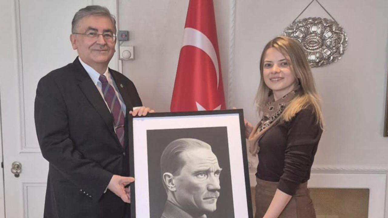 Sanatçı Binnur Engin tarafından hazırlanan, 36x51 cm ölçülerinde, karakalem, kömür ve kuru boya teknikleriyle çalışılmış Atatürk portresi, Londra Başkonsolosu Dr. Hasan Ulusoy’a hediye edildi.