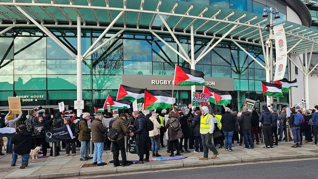 İngiltere’nin başkenti Londra’daki Twickenham Ragbi Stadyumu önünde toplanan vatandaşlar, statta düzenlenen Uluslararası Zırhlı Araçlar Fuarını, İsrail'in de kullandığı askeri araçları satan firmaların da katılımı nedeniyle protesto etti. Kentin güneyindeki Twickenham Stadı çevresinde toplanan yüzlerce kişi, İsrail'in Gazze saldırılarında işbirliği içinde olduğunu belirttiği şirketlere tepki gösterdi.Göstericiler, İngiltere Ragbi Futbol Federasyonunu da fuara ev sahipliği yaptığı için eleştirdi.Fuara katılan şirketlere yönelik, "Sizden utanıyoruz" sloganı atan protestocular, İsrail'e silah satışının suç ortaklığı olduğunu belirten pankartlar da taşıdı.Şirketlerin karlarının Filistinlilerin kanlarına bulandığını da dile getiren göstericiler, "Netanyahu göreceksin Filistin özgür olacak", "Yahudiliğe evet, Siyonizme hayır" ve "Twickenham Stadı saklanamazsın seni soykırımla yargılayacağız," şeklinde slogan attı.