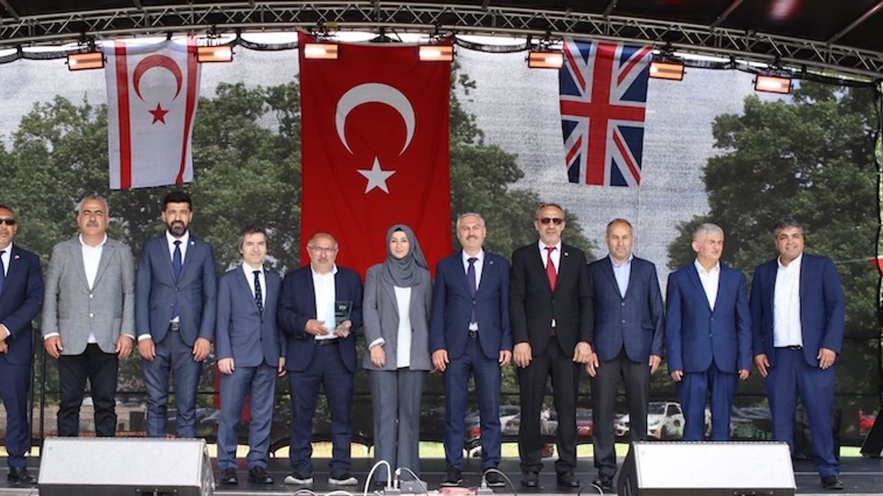 Londra Büyükelçisi Osman Koray Ertaş ile British Turkish Association Başkanı Murat Şükrü Acar, Luton Türk Derneği ve Festivali’nin Kurucusu Atilla Üstün’e Yaşam Boyu Onur ve Başarı Ödülü plaketi verdi.