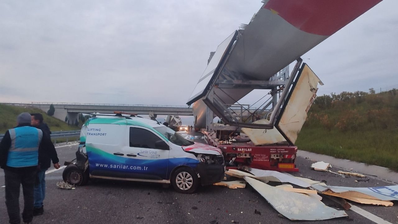 Alınan bilgiye göre, sabah saatlerinde otoyolun Saruhanlı ilçesi geçişinde R.E'nin kullandığı 34 DMZ 923 plakalı kamyon, önünde seyreden G.A. idaresindeki 41 APK 042 plakalı kamyonete ve sürücüsü henüz öğrenilemeyen 41 AGR 210 plakalı rüzgar türbini kanadı taşıyan tıra arkadan çarptı.