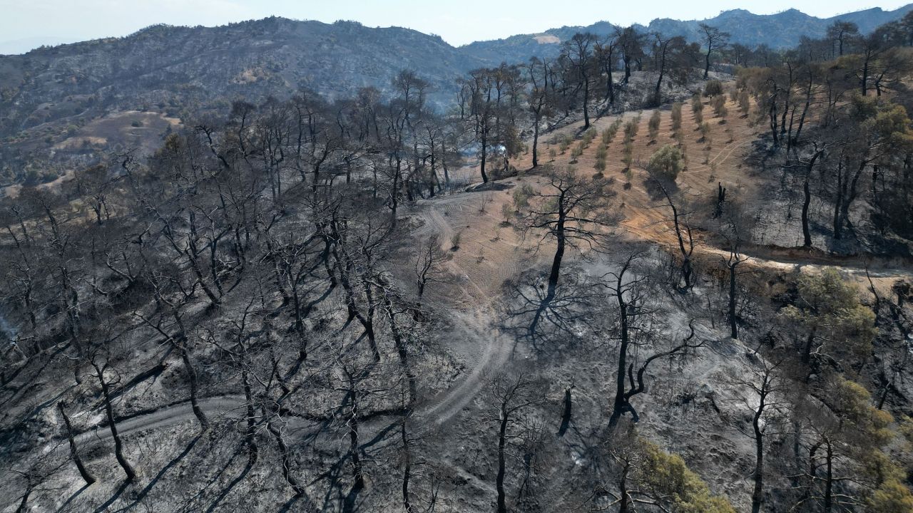 Sarp arazide yoğun kızılçam ormanlarının yanı sıra zeytin, erik ve kiraz bahçelerinin yer aldığı bölgede yangın sonrası yeşil alanlar yerini gri renge bıraktı.