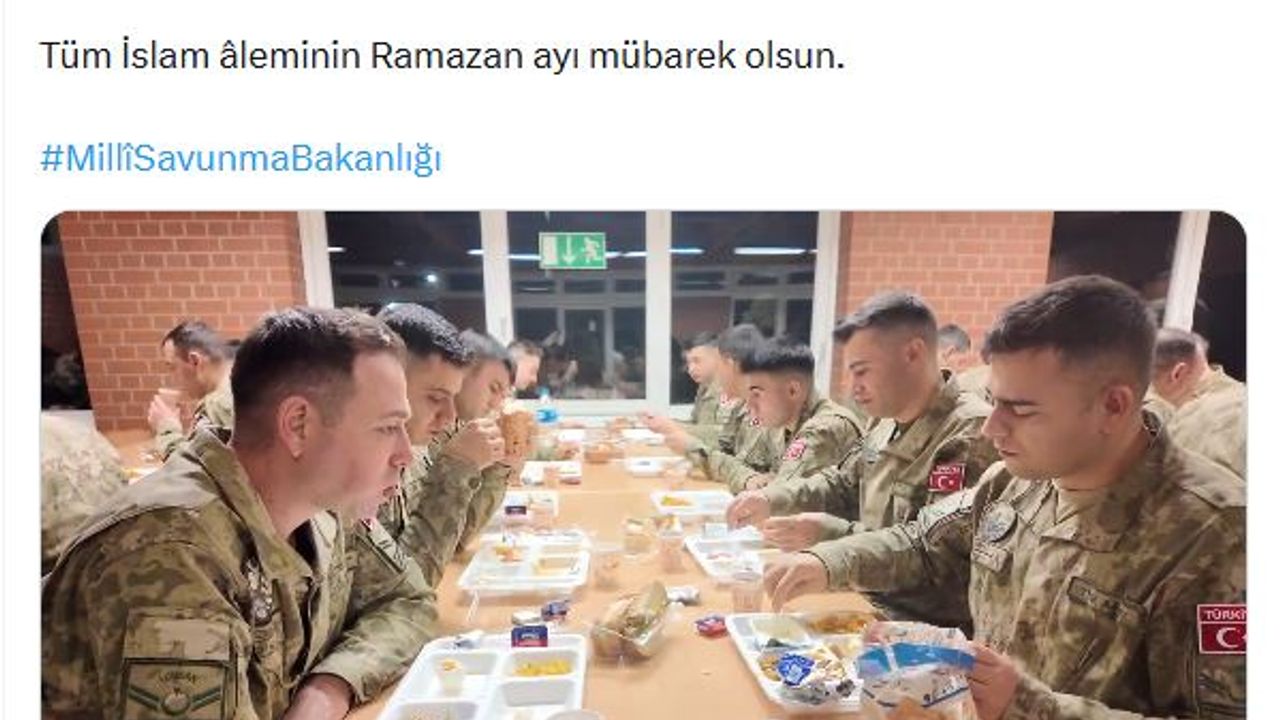 Bakanlığın sanal medya hesabından paylaşılan görüntülerle birlikte, 'Yurdun dört bir yanında ve dünyanın birçok bölgesinde görev yapan Kahraman Mehmetçiklerimiz ilk sahurlarını yaptı. Tüm İslam aleminin ramazan ayı mübarek olsun' denildi. (DHA)