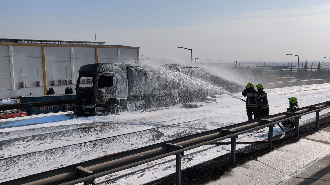 Olay, Mersin-Adana Otoyolu Mersin Serbest Bölge bağlantı yolunda meydana geldi. Ebubekir Güven idaresindeki 26 VF 647 plakalı akaryakıt yüklü tanker, henüz bilinmeyen nedenle alev aldı. Durumu fark eden şoför, aracı durdurarak ihbarda bulundu. İhbarla olay yerine 112 acil sağlık, itfaiye ve polis ekipleri sevk edildi. Çevrede güvenlik önlemi alan polis ekipleri, bağlantı yolunun çift şeridini trafiğe kapattı. Dumanın gökyüzünü kapladığı yangın, itfaiye ekiplerinin uzun uğraşları sonucu söndürüldü. Soğutma çalışmalarının ardından kapatılan yol, yeniden açıldı. Tankerin alev alev yandığı anlar kameraya yansırken; yangınla ilgili inceleme sürüyor. (DHA)