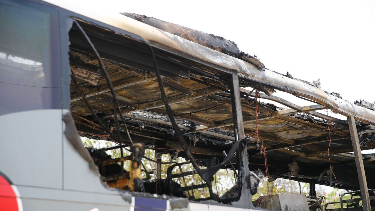 MERSİN (AA) - Mersin'in Toroslar ilçesinde seyir halindeyken alev alan yolcu otobüsü kullanılamaz hale geldi.