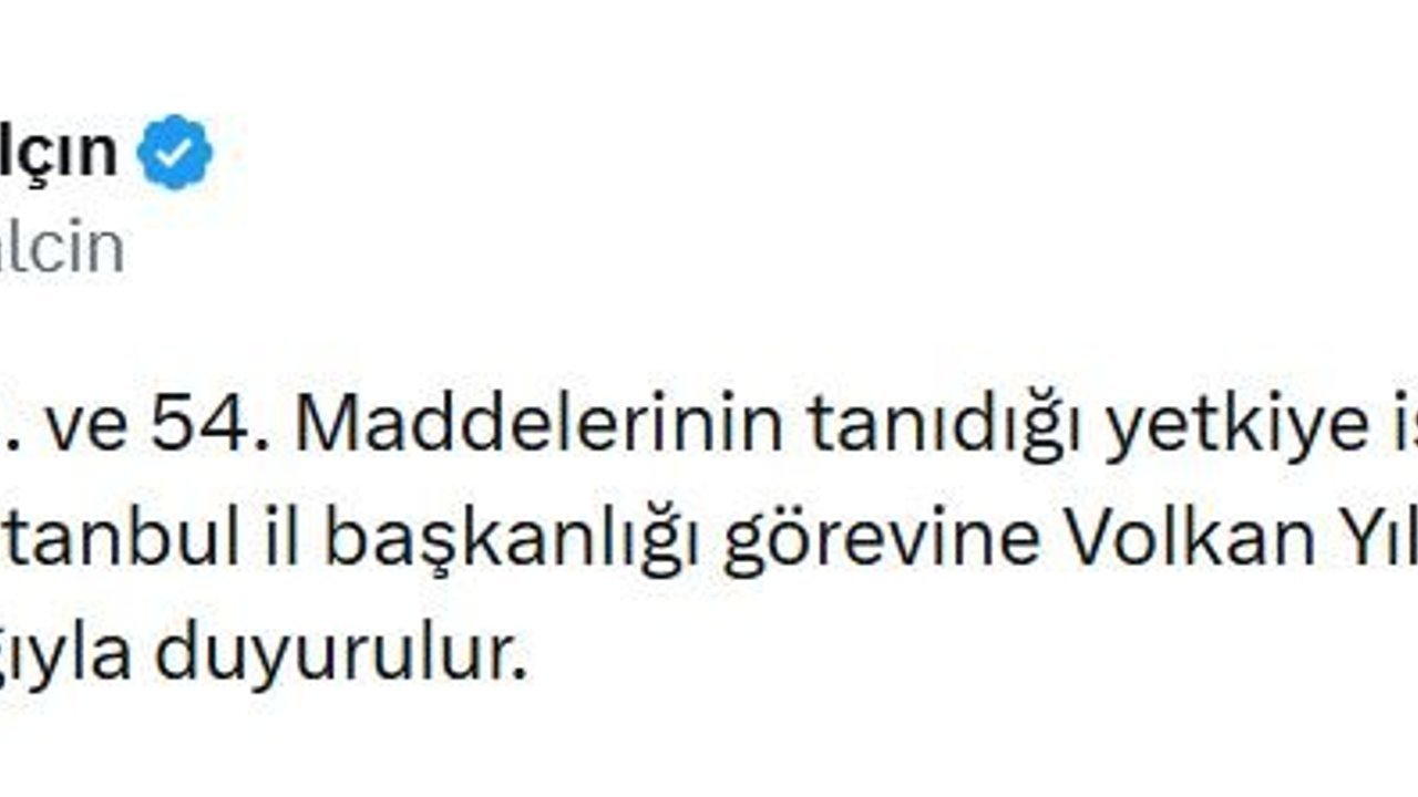 MHP Genel Başkan Yardımcısı Semih Yalçın, partisinin İstanbul İl Başkanlığı'na atama yapıldığını duyurdu. Yalçın, sanal medya hesabından yaptığı açıklamada, 'Tüzüğümüzün 52 ve 54'üncü maddelerinin tanıdığı yetkiye istinaden Milliyetçi Hareket Partisi İstanbul İl Başkanlığı görevine Volkan Yılmaz atanmıştır' dedi. (DHA)