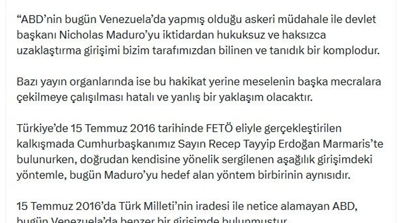 'ABD'nin bugün Venezuela'da yapmış olduğu askeri müdahale ile devlet başkanı Nicholas Maduro'yu iktidardan hukuksuz ve haksızca uzaklaştırma girişimi bizim tarafımızdan bilinen ve tanıdık bir komplodur. Bazı yayın organlarında ise bu hakikat yerine meselenin başka mecralara çekilmeye çalışılması hatalı ve yanlış bir yaklaşım olacaktır. Türkiye'de 15 Temmuz 2016 tarihinde FETÖ eliyle gerçekleştirilen kalkışmada Cumhurbaşkanımız Sayın Recep Tayyip Erdoğan Marmaris'te bulunurken, doğrudan kendisine yönelik sergilenen aşağılık girişimdeki yöntemle, bugün Maduro'yu hedef alan yöntem birbirinin aynısıdır. 15 Temmuz 2016'da Türk Milleti'nin iradesi ile netice alamayan ABD, bugün Venezuela'da benzer bir girişimde bulunmuştur. Konunun bu yönünün yayın ve yorumlarda ele alınması, yöntemdeki benzerliğin kamuoyunun dikkatine sunulması daha doğru olacaktır.' (DHA)