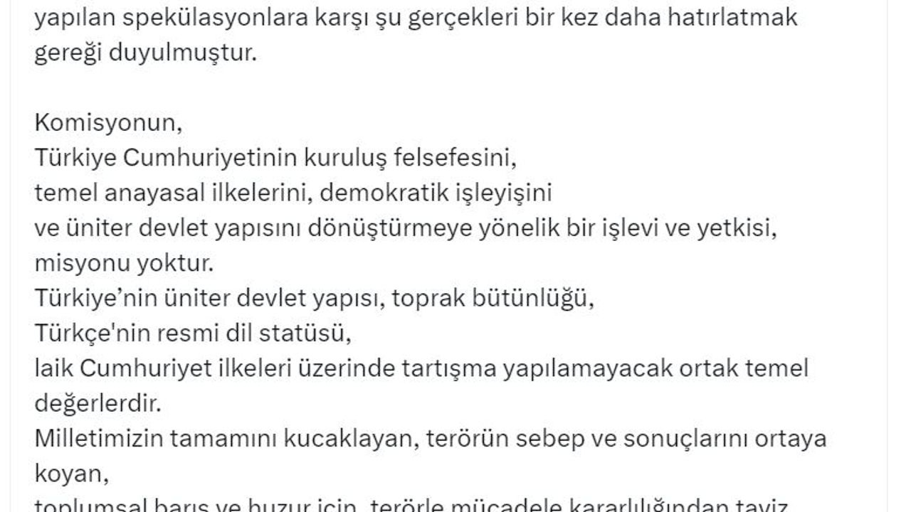 MHP'li Yıldız, sanal medya hesabından yaptığı açıklamada, 'Milli Dayanışma, Kardeşlik ve Demokrasi Komisyonu'nun raporu üzerinde yapılan spekülasyonlara karşı şu gerçekleri bir kez daha hatırlatmak gereği duyulmuştur. Komisyonun, Türkiye Cumhuriyeti'nin kuruluş felsefesini, temel anayasal ilkelerini, demokratik işleyişini ve üniter devlet yapısını dönüştürmeye yönelik bir işlevi ve yetkisi, misyonu yoktur. Türkiye'nin üniter devlet yapısı, toprak bütünlüğü, Türkçe'nin resmi dil statüsü, laik Cumhuriyet ilkeleri üzerinde tartışma yapılamayacak ortak temel değerlerdir. Milletimizin tamamını kucaklayan, terörün sebep ve sonuçlarını ortaya koyan, toplumsal barış ve huzur için, terörle mücadele kararlılığından taviz verilmeden, hukukun üstünlüğü ilkesinden sapılmadan ve milli güvenlik kaygıları göz ardı edilmeden çerçeve metin hazırlanmaktadır' dedi. (DHA)