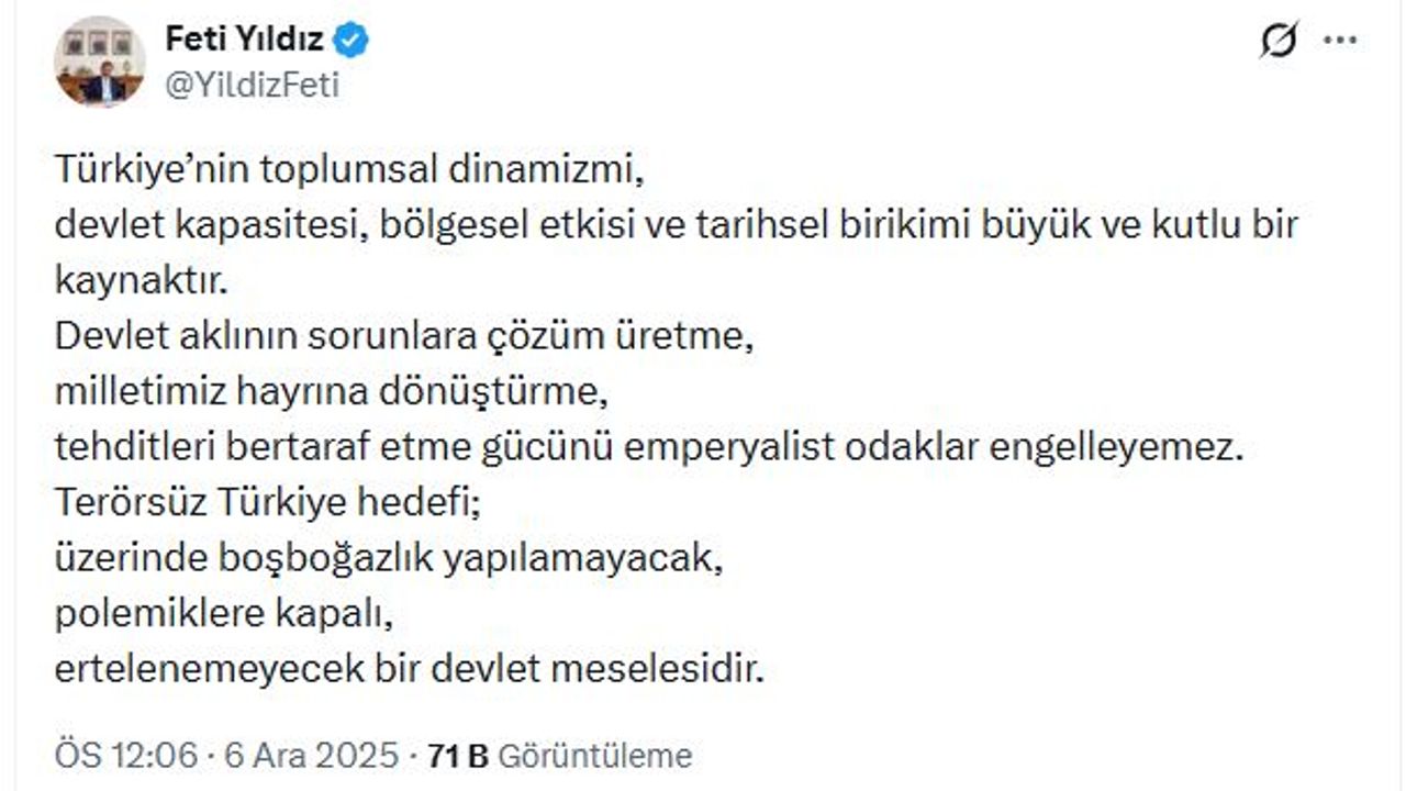 MHP Genel Başkan Yardımcısı Feti Yıldız, sosyal medya hesabından yaptığı açıklamada, 'Türkiye'nin toplumsal dinamizmi, devlet kapasitesi, bölgesel etkisi ve tarihsel birikimi büyük ve kutlu bir kaynaktır. Devlet aklının sorunlara çözüm üretme, milletimiz hayrına dönüştürme, tehditleri bertaraf etme gücünü emperyalist odaklar engelleyemez. 'Terörsüz Türkiye' hedefi; üzerinde boşboğazlık yapılamayacak, polemiklere kapalı, ertelenemeyecek bir devlet meselesidir' ifadelerini kullandı. (DHA)