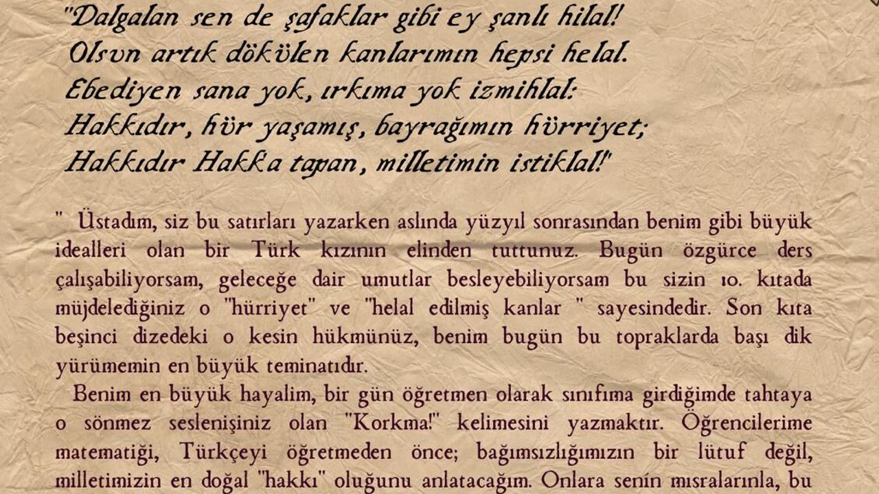 Üstadım, siz bu satırları yazarken aslında yüzyıl sonrasından benim gibi büyük idealleri olan bir Türk kızının elinden tuttunuz. Bugün özgürce ders çalışabiliyorsam, geleceğe dair umutlar besleyebiliyorsam bu sizin 10'uncu kıtada müjdelediğiniz o 'hürriyet' ve 'helal edilmiş kanlar' sayesindedir. Son kıta beşinci dizedeki o kesin hükmünüz, benim bugün bu topraklarda başı dik yürümemin en büyük teminatıdır. Benim en büyük hayalim, bir gün öğretmen olarak sınıfıma girdiğimde tahtaya o sönmez seslenişiniz olan 'Korkma!' kelimesini yazmaktır. Öğrencilerime matematiği, Türkçeyi öğretmeden önce; bağımsızlığımızın bir lütuf değil, milletimizin en doğal 'hakkı' oluğunu anlatacağım. Onlara senin mısralarınla, bu bayrağın neden sonsuza kadar dalgalanması gerektiğini ve Türk milletine asla 'yok oluş' kelimesinin yakışmayacağını ilmek ilmek işleyeceğim. Yarışmamızın adı gibi; 'Korkma, gençliğin ruhu burada!' evet, üstadım o ruh benim tertemiz kalemimde ve gelecekte sınıflarda yankılanacak olan sesimde yaşıyor. 10'uncu kıtadaki o ebedi istiklal sözünü, yetiştireceğim aydınlık nesillerle sonsuza dek koruyacağıma söz veriyorum. Bize bağımsızlığı bir onur, bir kimlik ve bir 'hak' olarak bıraktığınız için minnettarız. Emanetiniz; bir Türk kızının vizyonunda güvendedir. Ruhunuz şad olsun! Sonsuz saygı ve minnetle.' (DHA)