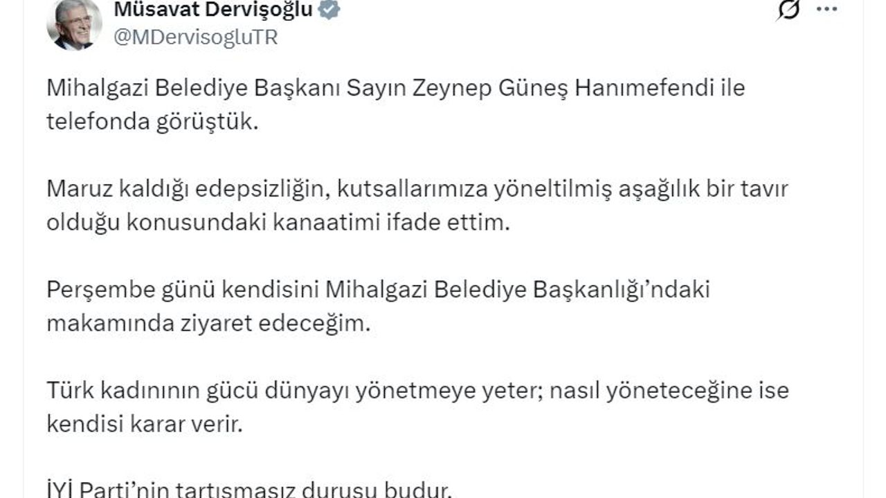 İYİ Parti Genel Başkanı Müsavat Dervişoğlu, Eskişehir Büyükşehir Belediye Başkanı Zeynep Güneş Akgün olayıyla ilgili sanal medya hesabından açıklama yaptı. Dervişoğlu, 'Mihalgazi Belediye Başkanı Sayın Zeynep Güneş Hanımefendi ile telefonda görüştük. Maruz kaldığı edepsizliğin, kutsallarımıza yöneltilmiş aşağılık bir tavır olduğu konusundaki kanaatimi ifade ettim. Perşembe günü kendisini Mihalgazi Belediye Başkanlığı'ndaki makamında ziyaret edeceğim. Türk kadınının gücü dünyayı yönetmeye yeter; nasıl yöneteceğine ise kendisi karar verir. İYİ Parti'nin tartışmasız duruşu budur' dedi. (DHA)
