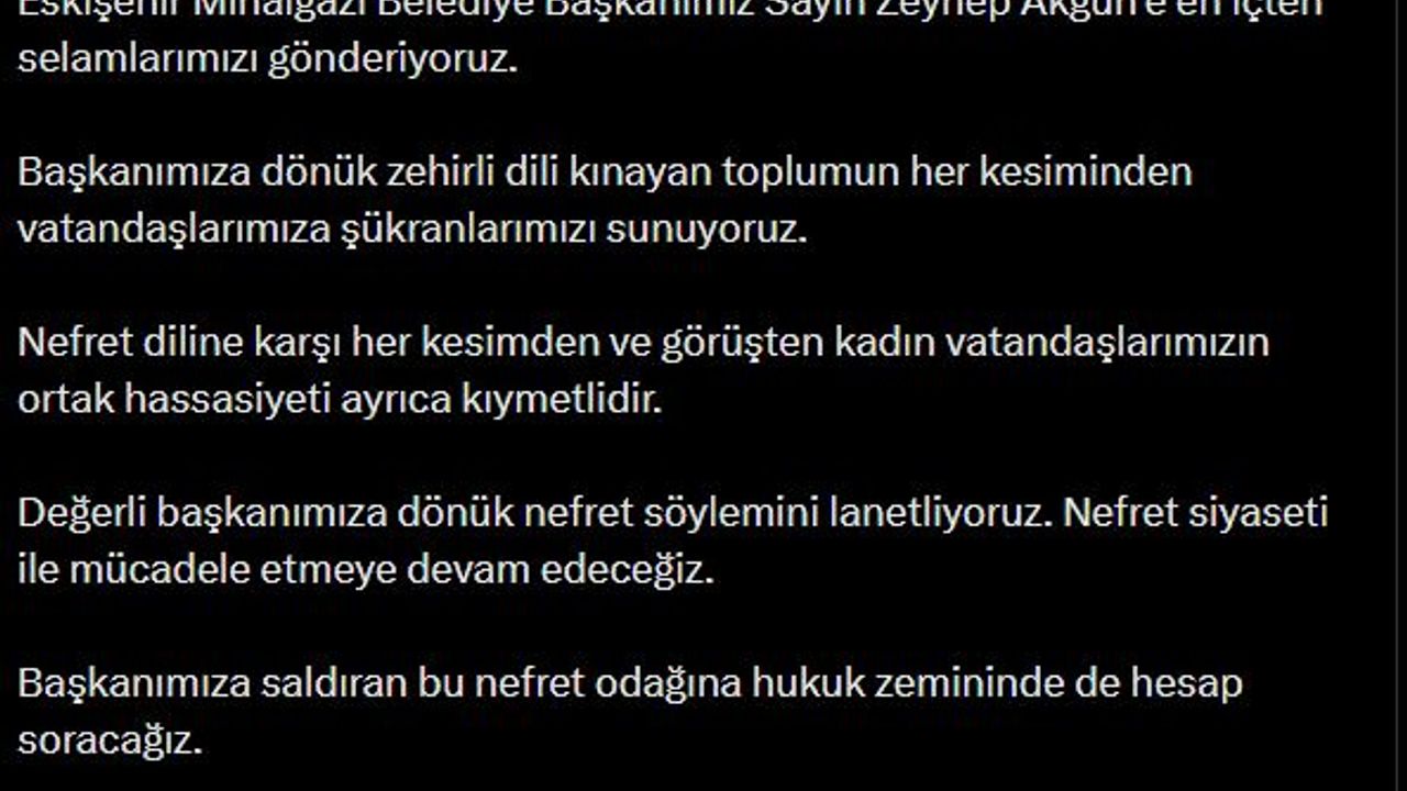 AK Parti Genel Başkan Yardımcısı ve Parti Sözcüsü Ömer Çelik, olayla ilgili sanal medya hesabından yaptığı açıklamada, 'Eskişehir Mihalgazi Belediye Başkanımız Sayın Zeynep Akgün'e en içten selamlarımızı gönderiyoruz. Başkanımıza dönük zehirli dili kınayan toplumun her kesiminden vatandaşlarımıza şükranlarımızı sunuyoruz. Nefret diline karşı her kesimden ve görüşten kadın vatandaşlarımızın ortak hassasiyeti ayrıca kıymetlidir. Değerli başkanımıza dönük nefret söylemini lanetliyoruz. Nefret siyaseti ile mücadele etmeye devam edeceğiz. Başkanımıza saldıran bu nefret odağına hukuk zemininde de hesap soracağız. İyi Parti'nin bu nefret odağına karşı gerekeni yapmasını bekliyoruz' dedi. (DHA)