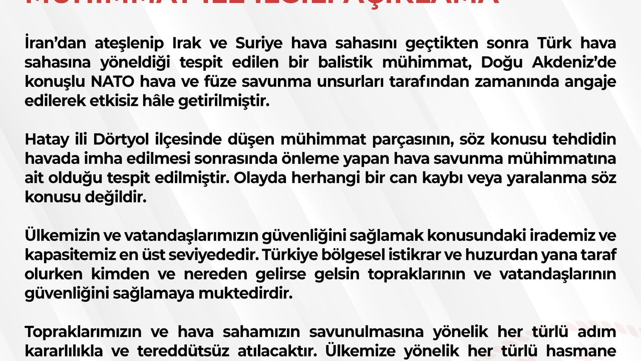 Bakanlığın sanal medya hesabından yapılan açıklamada, 'İran'dan ateşlenip Irak ve Suriye hava sahasını geçtikten sonra Türk hava sahasına yöneldiği tespit edilen bir balistik mühimmat, Doğu Akdeniz'de konuşlu NATO hava ve füze savunma unsurları tarafından zamanında angaje edilerek etkisiz hale getirilmiştir. Hatay ili Dörtyol ilçesinde düşen mühimmat parçasının, söz konusu tehdidin havada imha edilmesi sonrasında önleme yapan hava savunma mühimmatına ait olduğu tespit edilmiştir. Olayda herhangi bir can kaybı veya yaralanma söz konusu değildir' denildi.