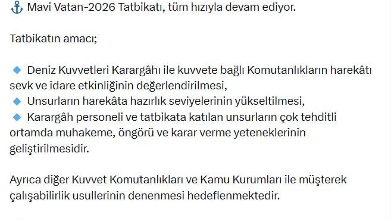 Bakanlığın sanal medya hesabından yapılan açıklamada, 'Mavi Vatan emin ellerde. 3-9 Nisan 2026 Karadeniz, Ege Denizi ve Doğu Akdeniz; Mavi Vatan-2026 Tatbikatı tüm hızıyla devam ediyor. Tatbikatın amacı; Deniz Kuvvetleri Karargahı ile kuvvete bağlı komutanlıkların harekatı sevk ve idare etkinliğinin değerlendirilmesi, unsurların harekata hazırlık seviyelerinin yükseltilmesi, karargah personeli ve tatbikata katılan unsurların çok tehditli ortamda muhakeme, öngörü ve karar verme yeteneklerinin geliştirilmesidir. Ayrıca diğer Kuvvet Komutanlıkları ve Kamu Kurumları ile müşterek çalışabilirlik usullerinin denenmesi hedeflenmektedir' denildi.