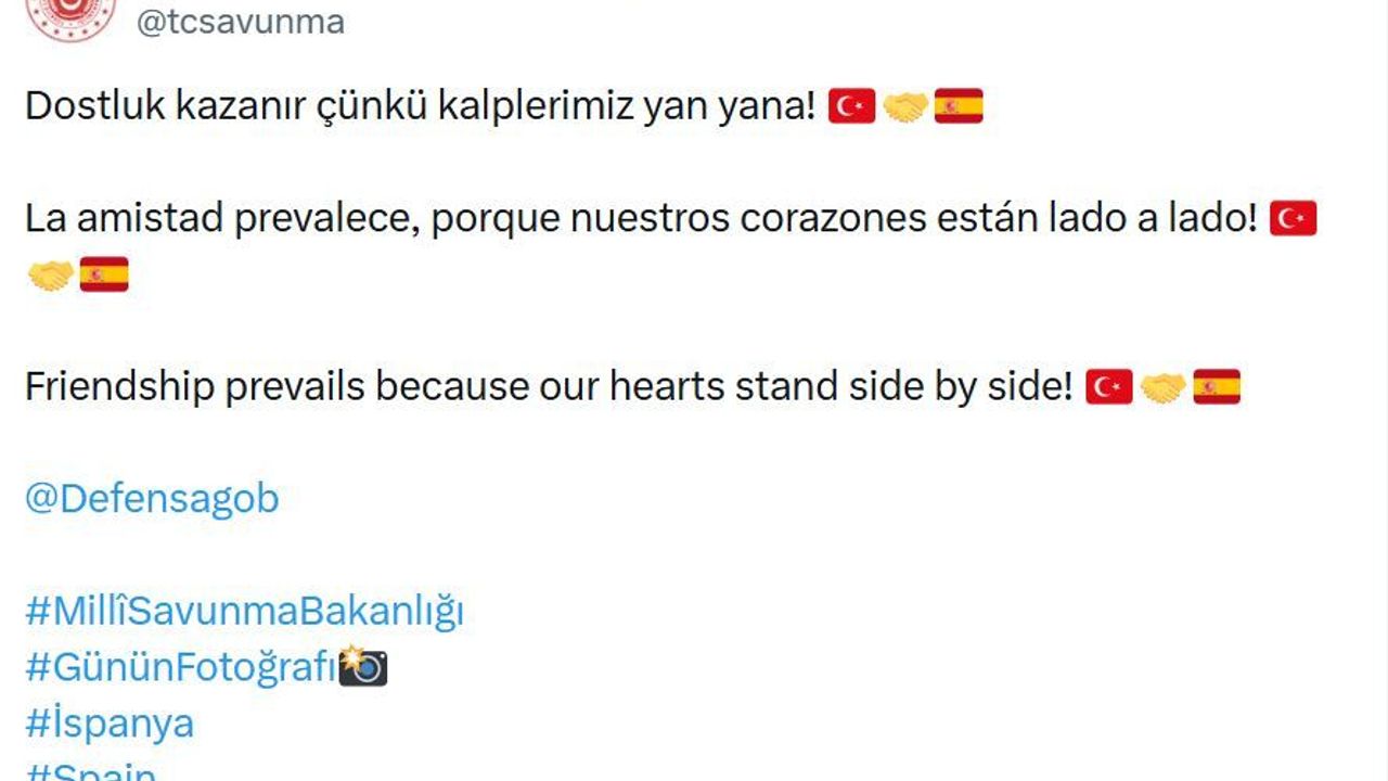 ANKARA, (DHA)- MİLLİ Savunma Bakanlığı (MSB), Almanya'da gerçekleştirilen tatbikatta Türk askeri ile İspanya askerinin çekilen fotoğrafını, 'Dostluk kazanır çünkü kalplerimiz yan yana' notuyla paylaştı.