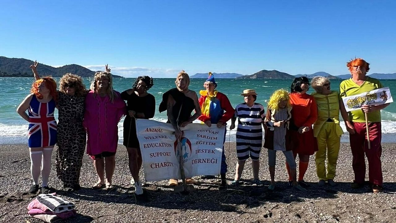 Gülgün AKYOKUŞ/FETHİYE (Muğla), (DHA)- MUĞLA'nın Fethiye ilçesinde yaşayan çoğunluğu İngilizlerden oluşan yerleşik yabancılar, yeni yılın ilk gününde yardıma muhtaç çocuklar ve sokak hayvanları için Çalış Plajı'nda değişik kostümlerle denize girdi.