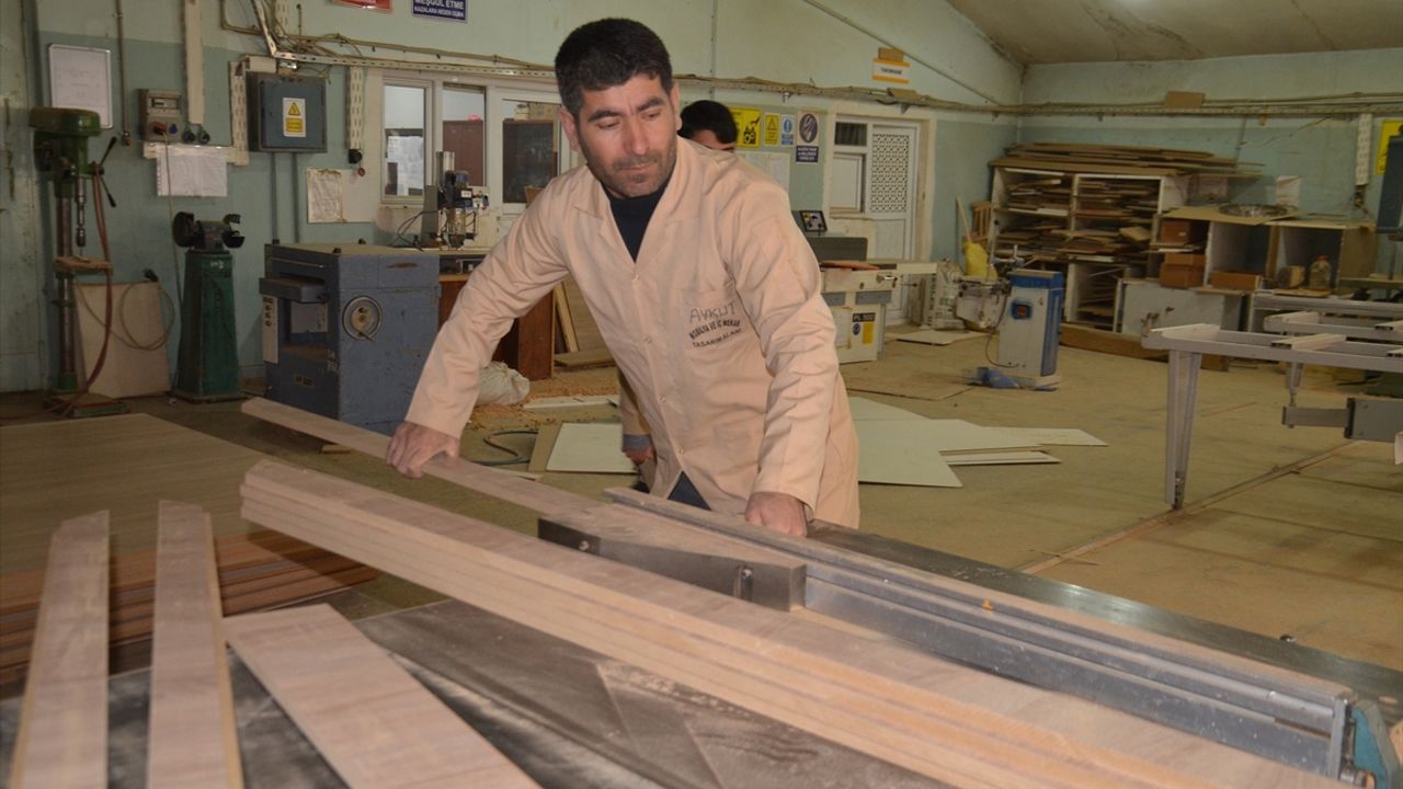 Hürriyet Mahallesi'ndeki okulda 10, 11 ve 12. sınıflarda eğitim gören 100 öğrenci, öğretmenlerinin gözetiminde talepler doğrultusunda masa, sıra, dolap, bank, çardak ve kameriye gibi ürünler yapıyor.