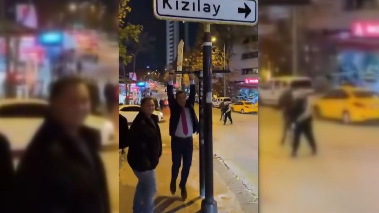 ANKARA, (DHA)- CHP Erzincan Milletvekili Mustafa Sarıgül, gençlerin asılarak fotoğraf çektirdiği 'Kızılay' yön tabelasının yanındaki demirde poz vererek vatandaşlarla bir araya geldi.