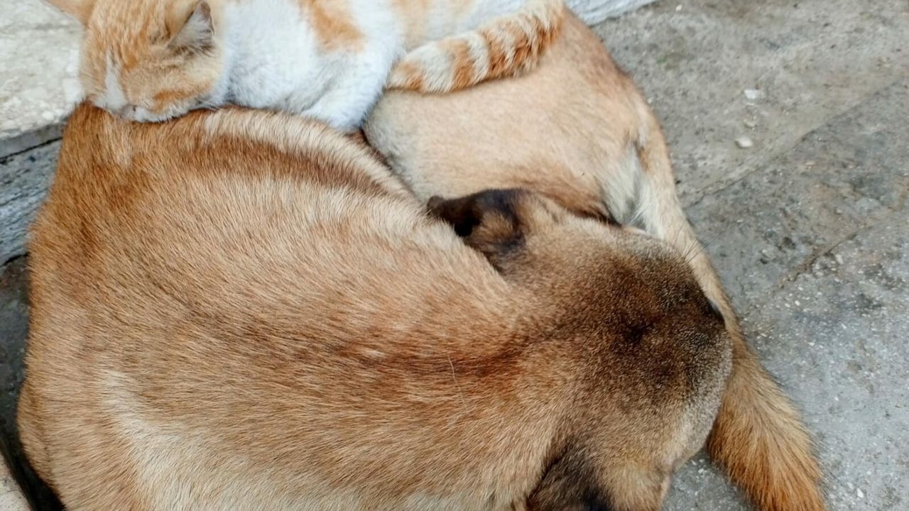 Nazilli Cumhuriyet Mahallesi'nde Hükümet Konağı giriş kapısı yakınında soğuk havada bir kedi ile köpeğin koyun koyuna yatması görenleri şaşırtıyor. Aynı kaptan mama yiyip, zaman zaman köpeğin sırtında uyuyan kedi dikkat çekiyor. İki hayvan arasındaki bağ, çevredekiler tarafından cep telefonu kamerasıyla görüntülendi. (DHA)