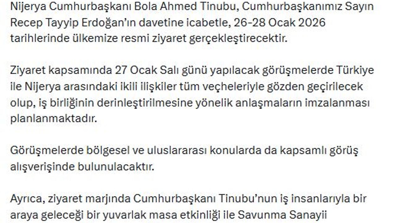 İletişim Başkanı Burhanettin Duran, sanal medya hesabından yaptığı açıklamada, 'Nijerya Cumhurbaşkanı Bola Ahmed Tinubu, Cumhurbaşkanımız Sayın Recep Tayyip Erdoğan'ın davetine icabetle, 26-28 Ocak 2026 tarihlerinde ülkemize resmi ziyaret gerçekleştirecektir. Ziyaret kapsamında 27 Ocak Salı günü yapılacak görüşmelerde Türkiye ile Nijerya arasındaki ikili ilişkiler tüm veçheleriyle gözden geçirilecek olup, iş birliğinin derinleştirilmesine yönelik anlaşmaların imzalanması planlanmaktadır. Görüşmelerde bölgesel ve uluslararası konularda da kapsamlı görüş alışverişinde bulunulacaktır. Ayrıca, ziyaret marjında Cumhurbaşkanı Tinubu'nun iş insanlarıyla bir araya geleceği bir yuvarlak masa etkinliği ile savunma sanayi toplantısının düzenlenmesi öngörülmektedir' ifadelerini kullandı. (DHA)