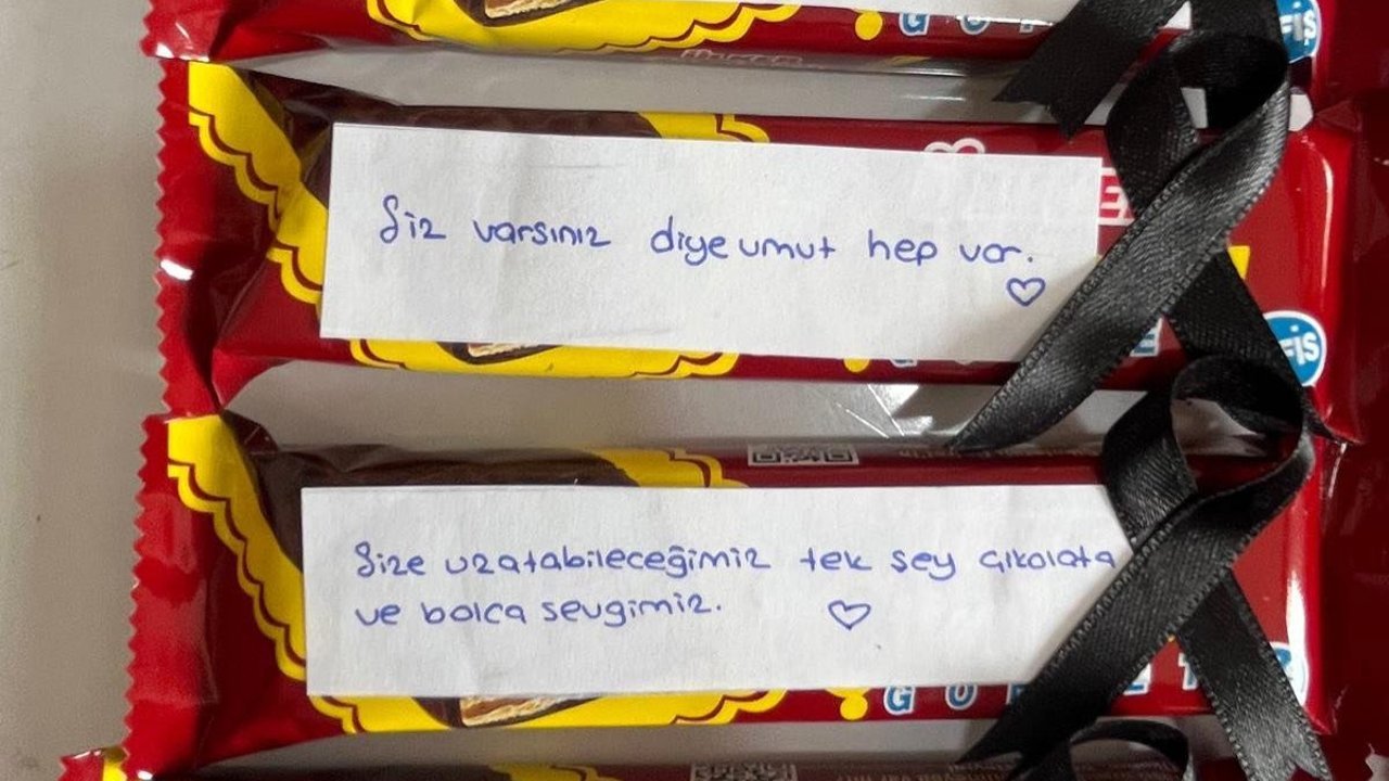 Şanlıurfa ve Kahramanmaraş'ta yaşanan okul saldırılarının ardından Yekta Baydar Ortaokulu öğrencileri, öğretmenlerine üzerlerinde destek mesajlarının yazılı olduğu ve siyah kurdele takılı çikolataları verdi. Öğrenciler, çikolataların üzerine, 'Size uzatabileceğimiz tek şey çikolata ve bolca sevgimiz', 'Nefret değil sevgi çoğalır', 'Sizinle öğrendik, sizinle güçlendik', 'Siz varsınız diye umut hep var' şeklinde yazılar yazarak ve siyah kurdele takarak, öğretmenlerine ikram etti. Öğretmenler, öğrencilerin bu anlamlı davranışlarından dolayı kendilerine teşekkür etti. Öğretmenlerde, sanal medya hesaplarında fotoğrafları paylaşarak, öğrencilerine sevgilerini iletti. (DHA)