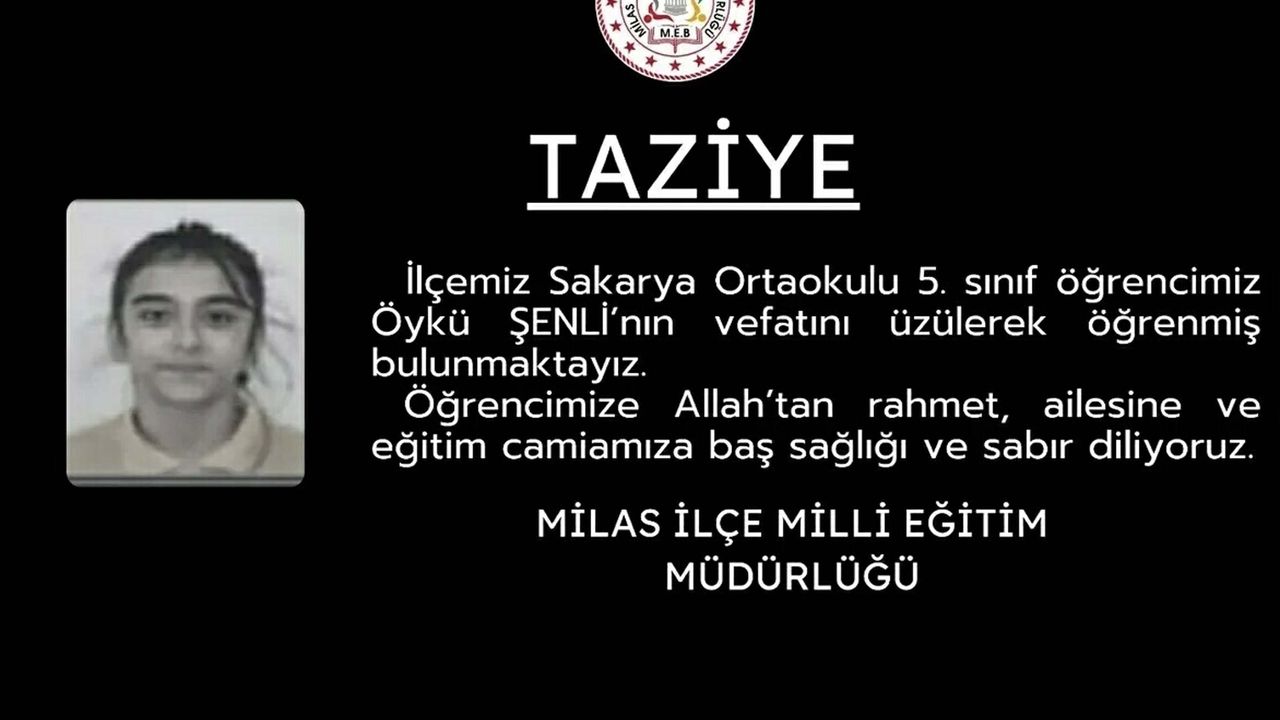 Öte yandan, Milas Milli Eğitim Müdürlüğü'nün sanal medya hesabından yapılan paylaşımda, 'İlçemiz Sakarya Ortaokulu 5'inci sınıf öğrencimiz Öykü Şenli'nin vefatını üzülerek öğrenmiş bulunmaktayız. Öğrencimize Allah'tan rahmet, ailesine ve eğitim camiamıza başsağlığı ve sabır diliyoruz' denildi. (DHA)