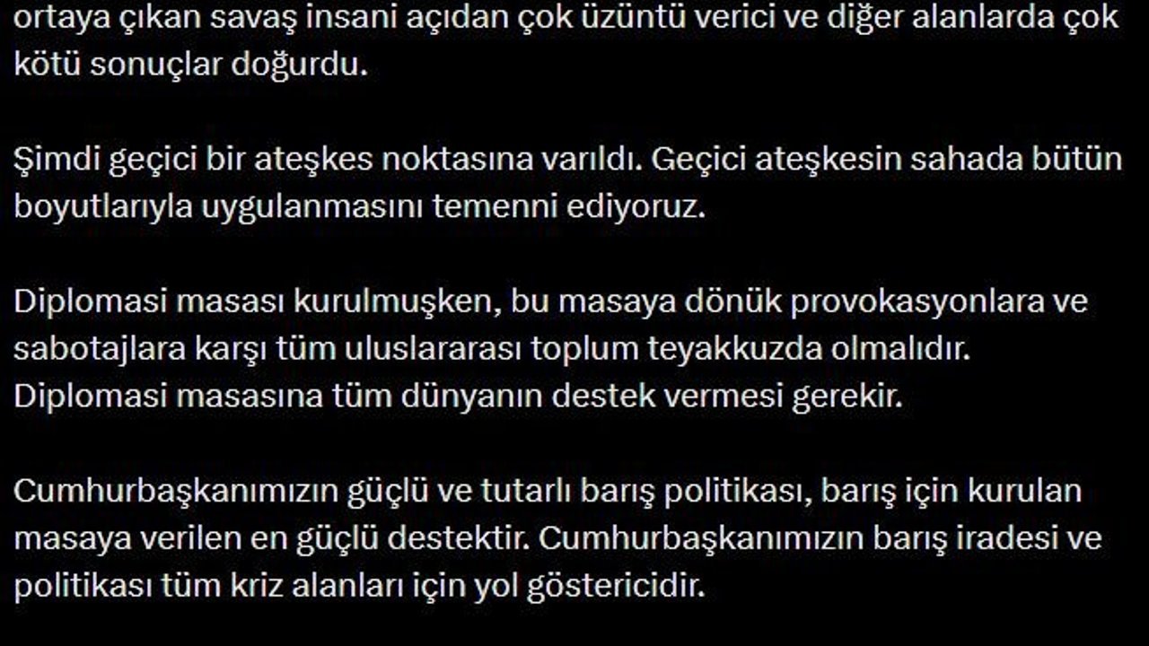 AK Parti Sözcüsü Ömer Çelik, sanal medya hesabından yaptığı açıklamada, 'ABD ve İsrail'in haksız ve hukuksuz şekilde İran'a saldırısı sonucunda ortaya çıkan savaş, insani açıdan çok üzüntü verici ve diğer alanlarda çok kötü sonuçlar doğurdu. Şimdi geçici bir ateşkes noktasına varıldı. Geçici ateşkesin sahada bütün boyutlarıyla uygulanmasını temenni ediyoruz. Diplomasi masası kurulmuşken, bu masaya dönük provokasyonlara ve sabotajlara karşı tüm uluslararası toplum teyakkuzda olmalıdır. Diplomasi masasına tüm dünyanın destek vermesi gerekir. Cumhurbaşkanımızın güçlü ve tutarlı barış politikası, barış için kurulan masaya verilen en güçlü destektir. Cumhurbaşkanımızın barış iradesi ve politikası, tüm kriz alanları için yol göstericidir. Kardeş Pakistan'a barış çabaları için teşekkür ediyoruz. Kardeş Pakistan'ı selamlıyoruz' dedi. (DHA)