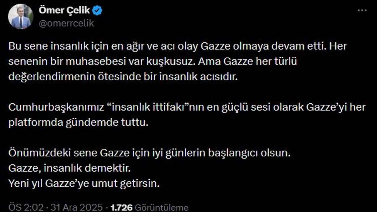 ANKARA, (DHA)- AK Parti Genel Başkan Yardımcısı ve Parti Sözcüsü Ömer Çelik, 'Önümüzdeki sene Gazze için iyi günlerin başlangıcı olsun. Gazze, insanlık demektir. Yeni yıl Gazze'ye umut getirsin' dedi.